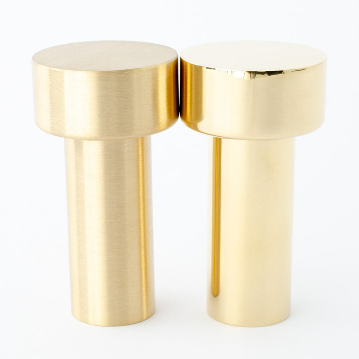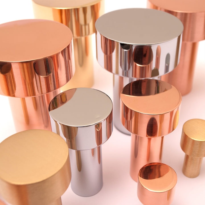 Solid polished brass, solid brushed brass, high-gloss polished and brushed stainless steel, or solid matte black aluminum.