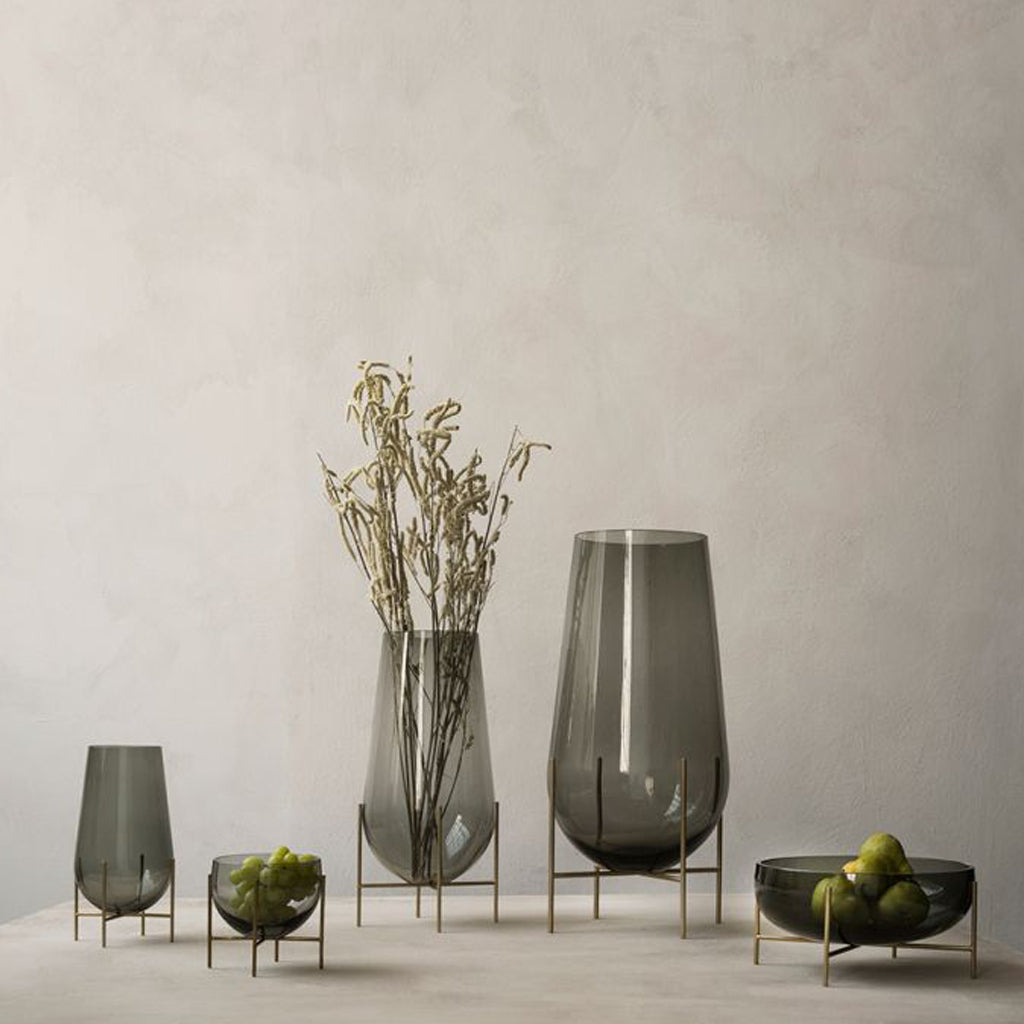 Inspired by laboratory test tubes. The drop-shaped form is as elegant whether holding flowers on a desk, on a nightstand left unfilled, or however you can imagine it. The smoked glass version with brushed brass legs is available in three sizes. The unique colour gradients of the glass give the design depth and contrast against the legs’ clean lines. The smallest vase is now available with clear glass and bronzed brass legs; a classic pairing to complement any interior palette, in a size ideal for more compact spaces.