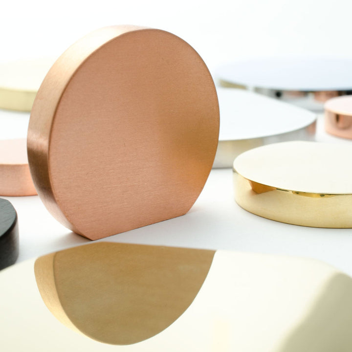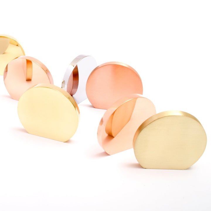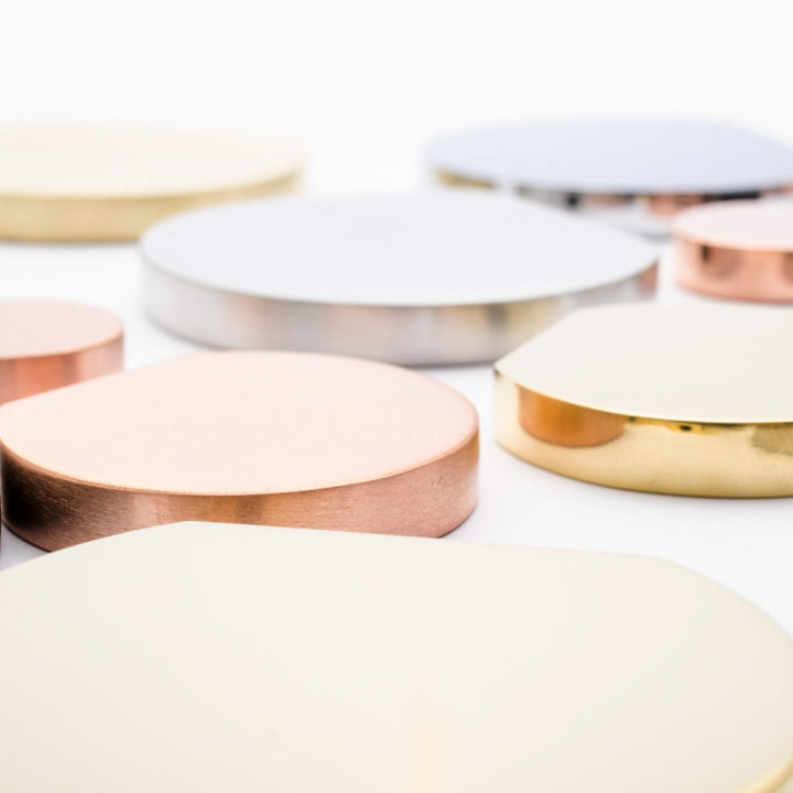Solid polished brass, solid brushed brass, solid polished copper, solid brushed copper, high-gloss polished and brushed stainless steel, or matte black aluminum.