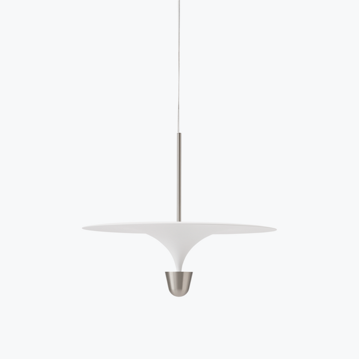 The Ø55 version features a curved rim that guides light toward dining tables and intimate seating areas, while the Ø60 variant takes on a flatter, trumpet-like profile, presents for a more horizontal, expansive presence. Both shapes share the same refined interplay of proportion, surface, and light—creating a statement that is as functional as it is atmospheric.