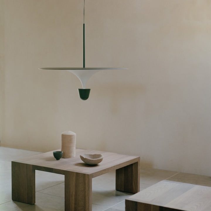 Kantarell Pendant Lamp – designed by Falke Svatun for New Works – balances sculptural elegance with graphic precision. Its form is defined by two concentric elements: a softly curved shade and a contrasting central reflector that casts light outward and downward in a warm, even spread.