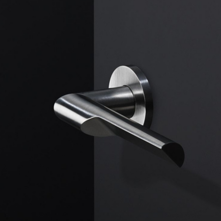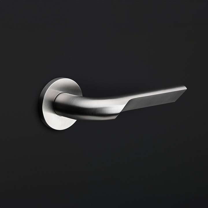 The RIVIO GL100-G Lever is part of the RIVIO hardware series by Gensler for FORMANI. Based on the transition from something lighter to something more solid, the flowing cutaways allow the thumb and fingers to engage in a uniquely comfortable way, affording a better grip and making opening and closing easier. Carved through the centre of its circular section, the handle continues its way back to the whole at a gentle incline. Ergonomic and elegant, it’s offered in two variants, with either a curve or a 90 degree angle leading to the neck and rose.