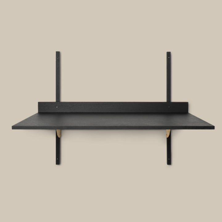 A new and modern take on Mid-century wall mounted desk units, Sector is defined by its sturdy simplicity and classic combination of wood and brass. Use the Sector Desk as a standalone surface or combine it with the Sector Shelves of your choice to form one integrated and cohesive workspace. A short border at the end of the desk forms a small, narrow space that’s ideal for propping up hand-written notes or a favourite photograph. Choose between natural oak veneer or black stained ash veneer with brackets of either polished or blackened brass. Other items in the collection are the Sector Single Shelf and the Sector Triple Shelf.
