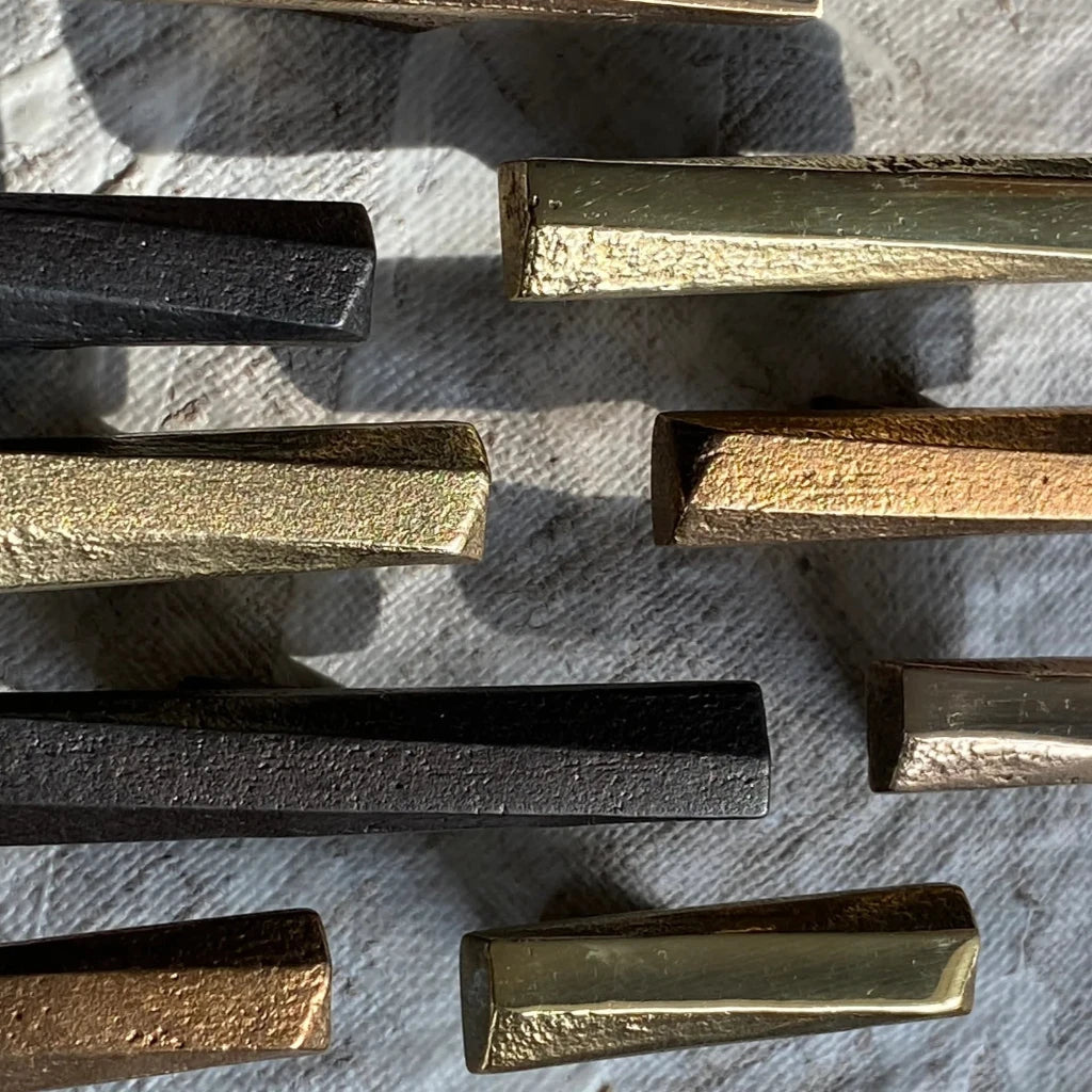With simple lines, and a modern rustic appeal this series of wares came about by the desire to make the cast bronze feel like it was twisted and had movement. The Skew Knob / Hook is the smallest item in the Skew Series, available in two sizes. These pieces are made from solid sand cast bronze and features a an organic textured surface.