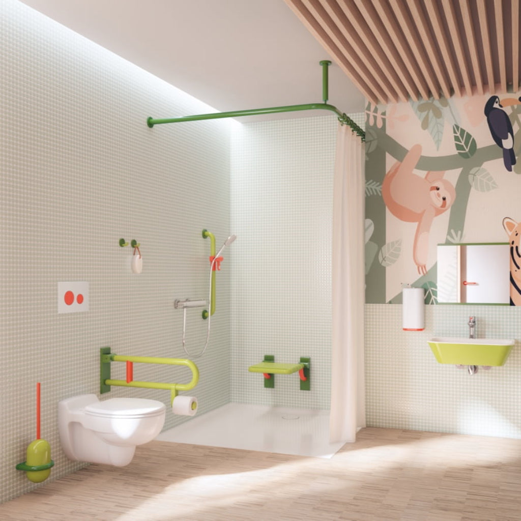 Bright, friendly colour and scaled accessibility support independence and imagination. Designed for schools, daycares, pediatric clinics, family rooms, and public washrooms, the 477/801 combinations introduce a playful yet safe environment for young users.