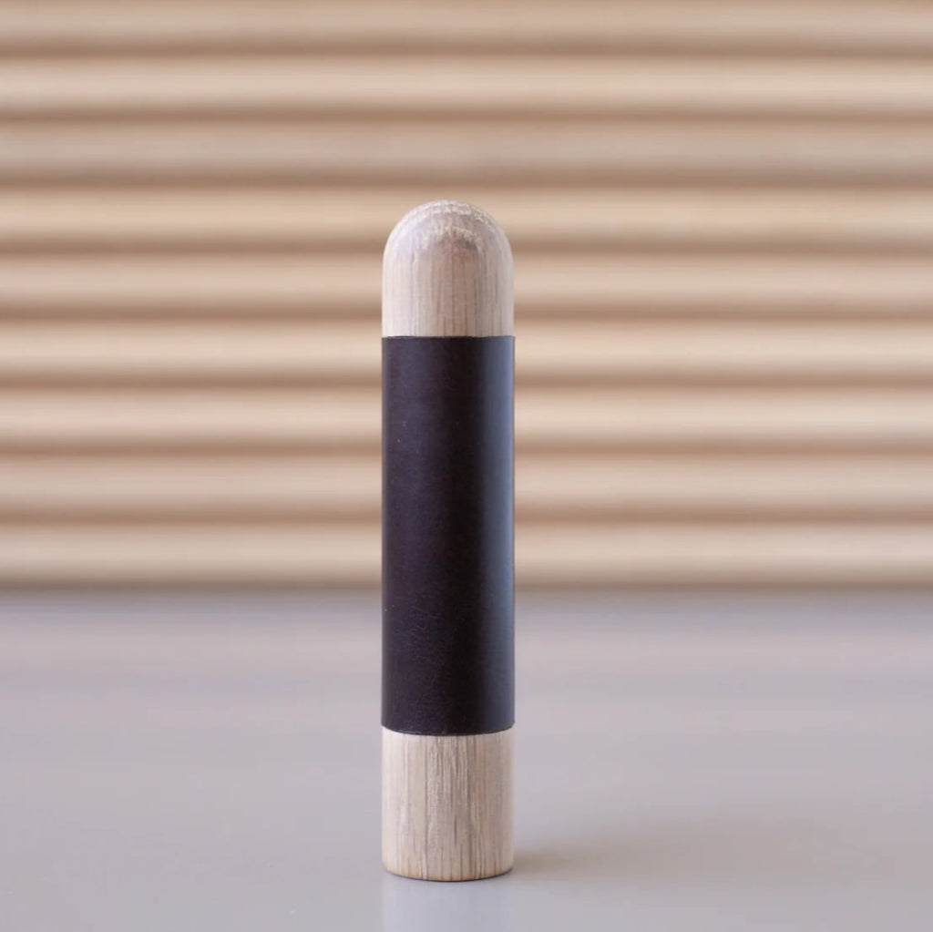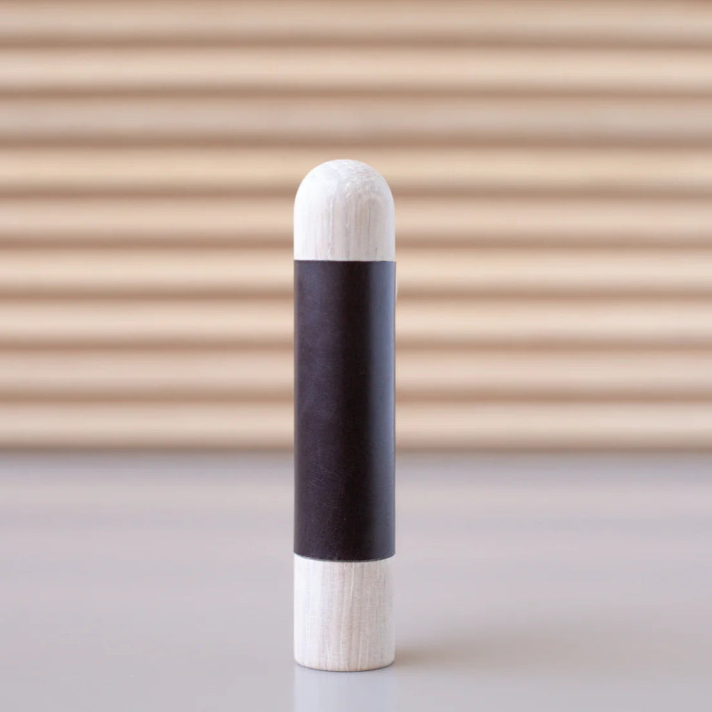 Solid hardwood with full hand-stitched leather wrap. Wood finished with OSMO poly oil — water-resistant and food-safe. Due to the natural characteristics of both wood and leather, variation in grain, tone, and texture is expected across pieces.