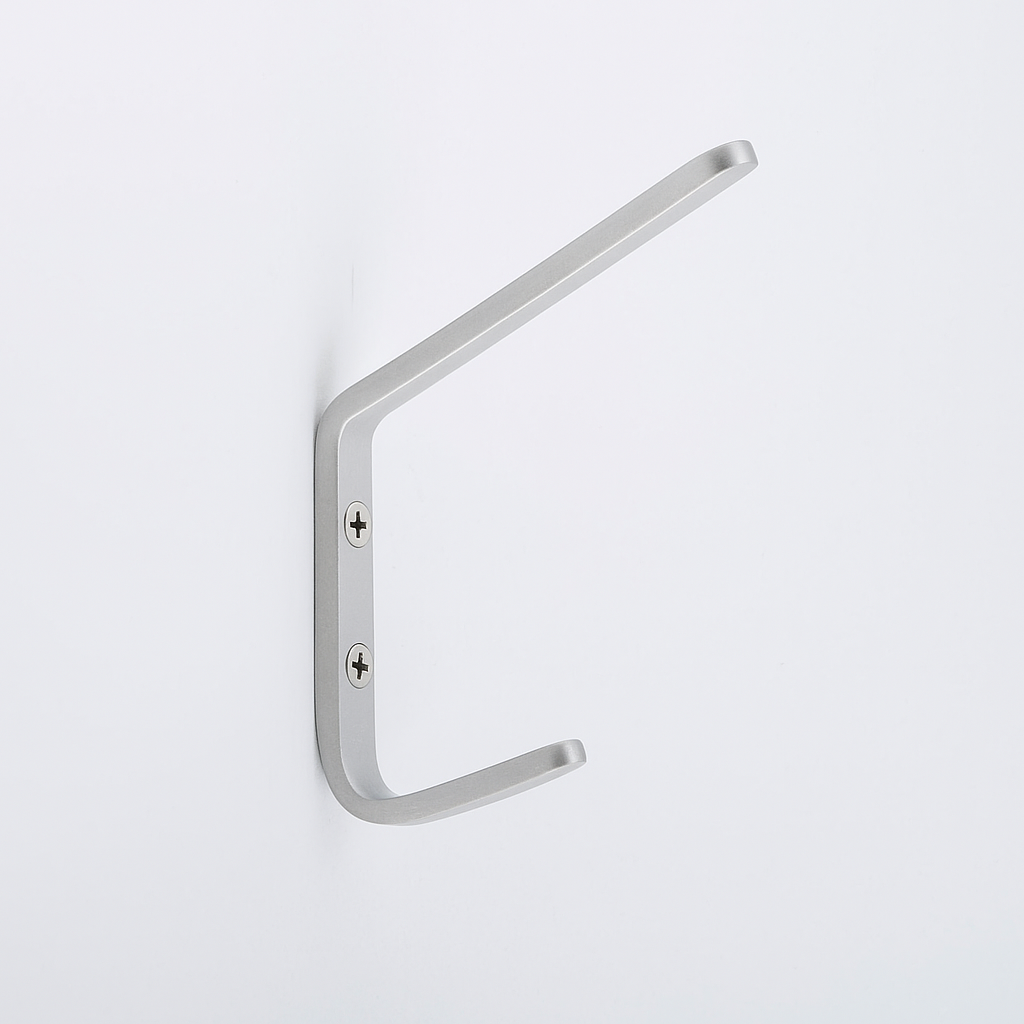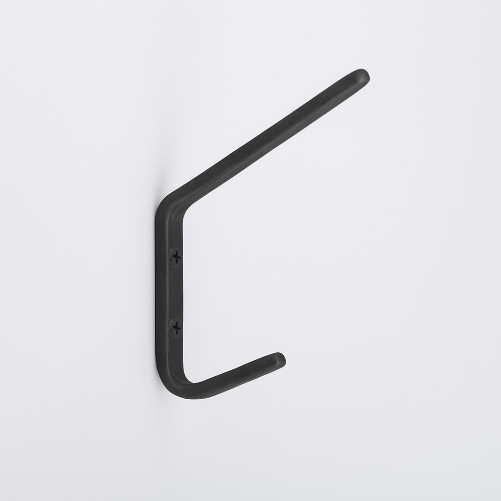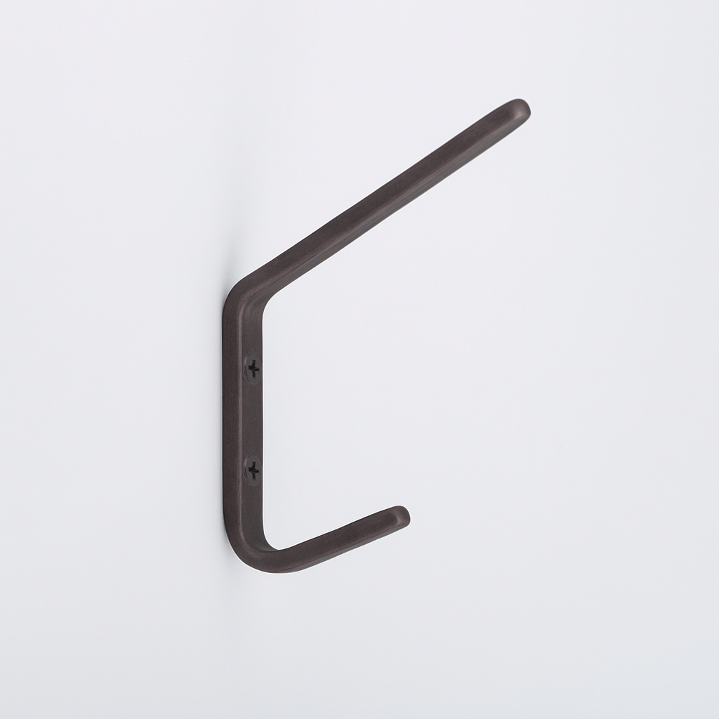 The Charlie Hook is a hardworking double hook with a clean, angular profile. Its slim vertical body supports two arms at staggered lengths: the shorter lower arm holds lighter items such as bags or coats, while the longer upper arm accommodates bulkier pieces. Minimal yet functional, it provides practical storage without excess detail.
