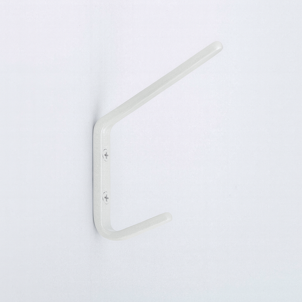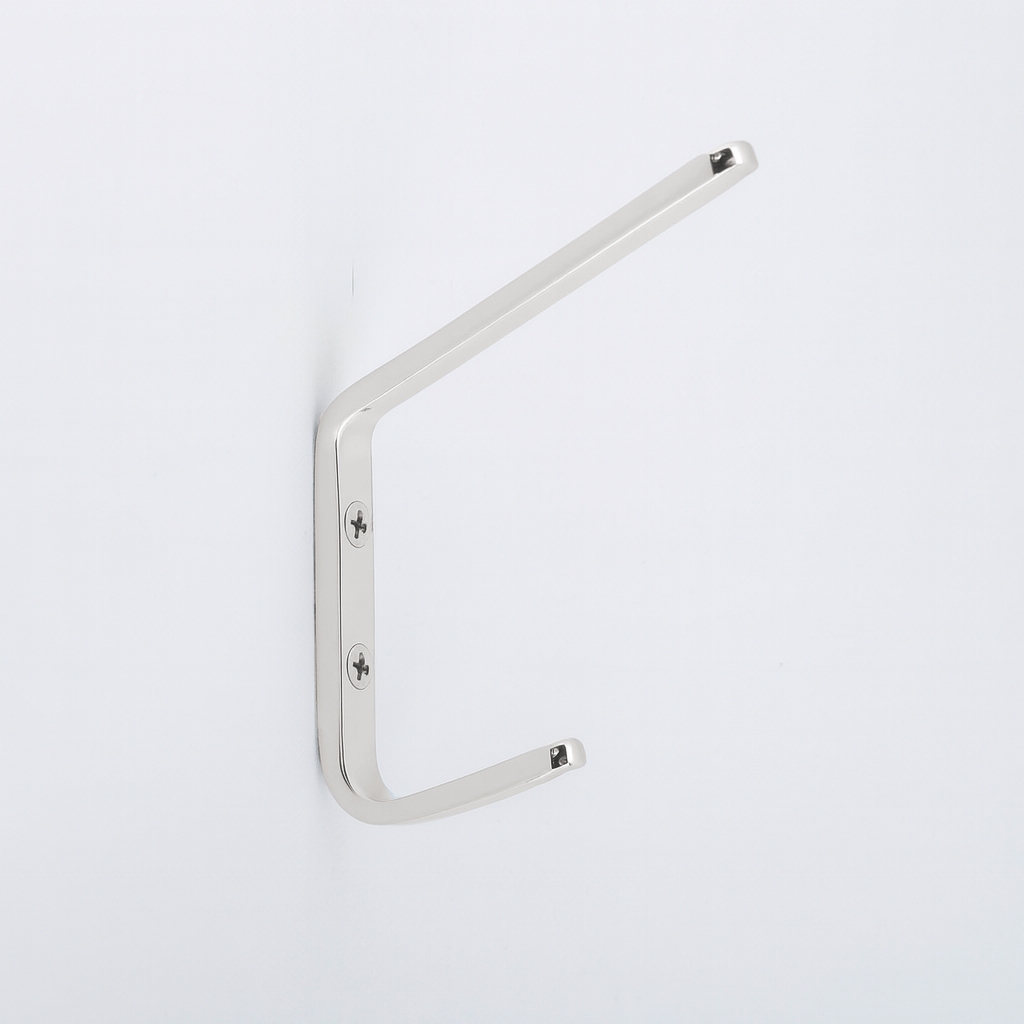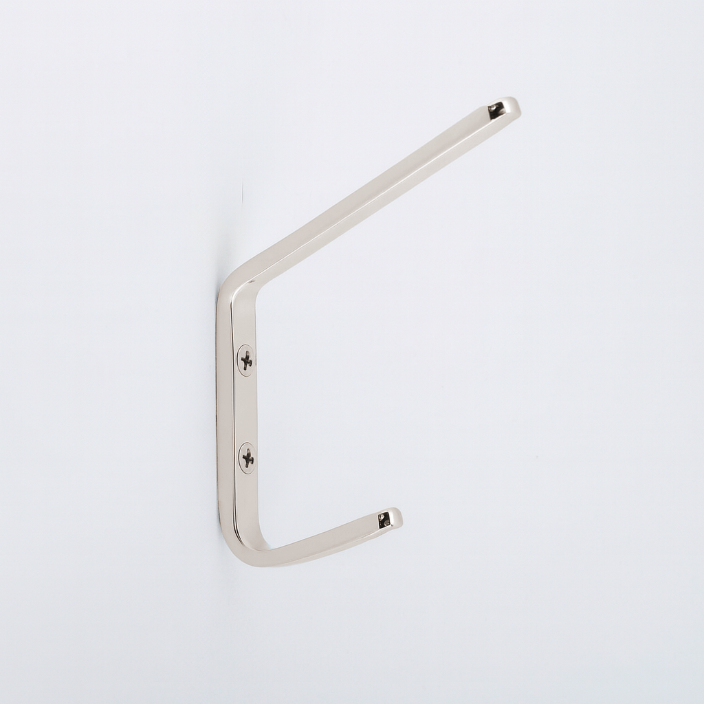 The Charlie Hook is a hardworking double hook with a clean, angular profile. Its slim vertical body supports two arms at staggered lengths: the shorter lower arm holds lighter items such as bags or coats, while the longer upper arm accommodates bulkier pieces. Minimal yet functional, it provides practical storage without excess detail.