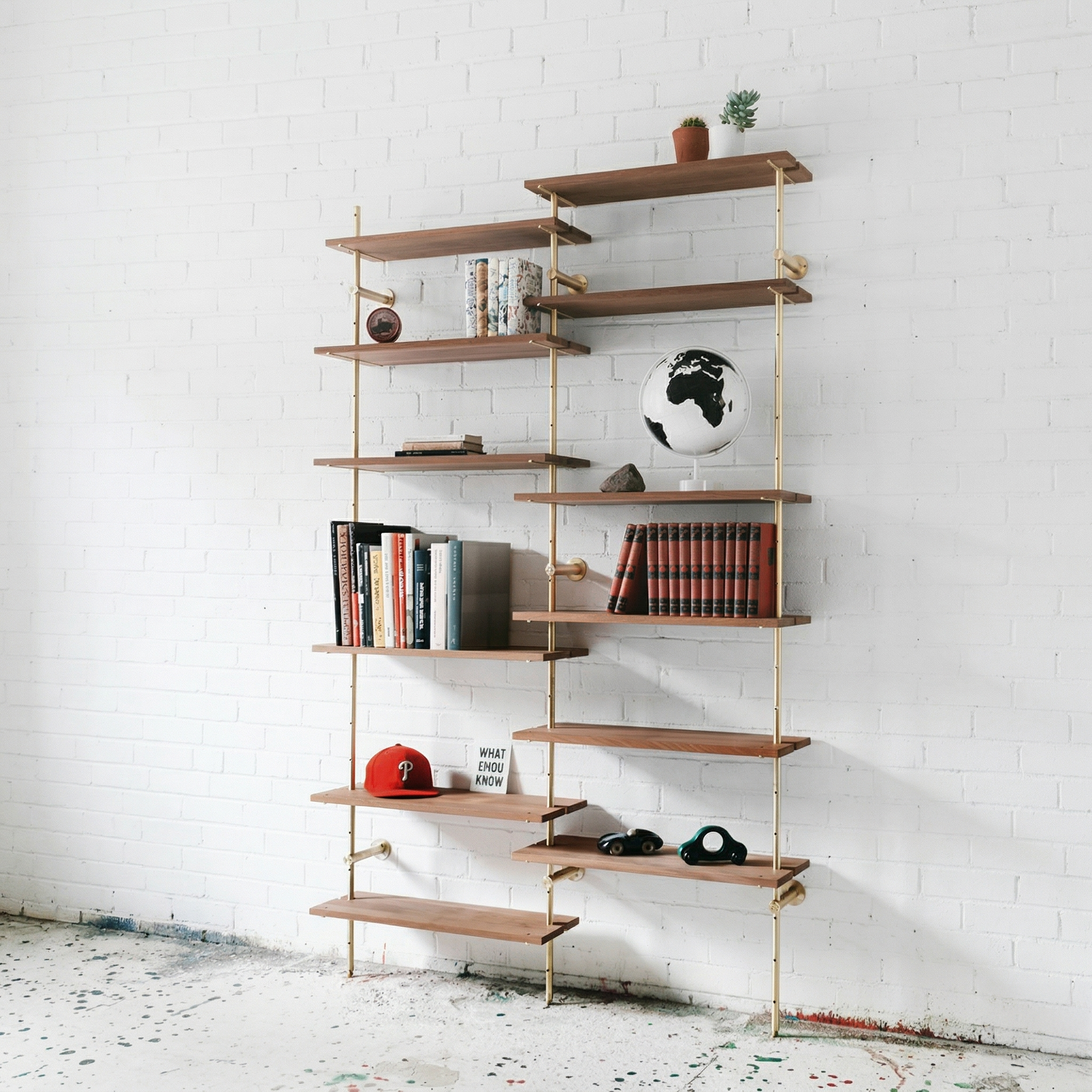 The Brass Rail Shelving by Object/Interface is a fully adjustable, partial wall-mounted shelving unit handmade with high-quality materials. The 27" wide solid sapele shelves hold up to 100 lbs (45 kg) each — suited for heavy art books or decorative display.